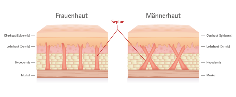 Betrachtet man ein Männer- und ein Frauenbein, sind die Unterschiede sofort zu erkennen. Während 80-90 % aller Frauen an Cellulite leiden, haben Männer oft eine straffe und dicke Haut. Grund dafür ist die besondere Beschaffenheit des Bindegewebes. Bei Männern bilden die Fasern des Bindegewebes ein geflechtartiges und dichtes Netz, das für Spannkraft sorgt und die Wassereinlagerung erschwert. Aus diesem Grund wirkt die Haut bei Männern eher straff. Bei Frauen befinden sich dehnbare Zellzwischenräume im Bindegewebe, in denen sich Wasser und Fett leichter ansammeln können. Die sichtbaren „Dellen“, die häufig auch als Cellulite oder Orangenhaut bezeichnet werden, sind also vergrößerte Fettzellen, die nicht mehr durch die Fasern des Bindegewebes zusammengehalten werden können. Hierbei ist zu sagen, dass jede Frau an Cellulite leiden kann, unabhängig von ihrem Gewicht. Aber nicht nur Fettzellen können für das Erschlaffen des Bindegewebes verantwortlich sein, sondern auch andere Faktoren wie Hormone oder erbliche Veranlagungen.