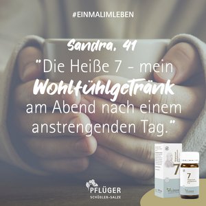 Als „Heiße 7“ bezeichnet man eine Lösung aus 10 Tabletten des Schüßler-Salzes Nr. 7 Magnesium phosphoricum in abgekochtem heißem Wasser, die schlückchenweise und langsam getrunken wird. Durch die Wärme entfaltet sich die wohltuende Wirkung noch schneller und fördert die Muskelentspannung. So eignet sich die „Heiße 7“ auch, um sich ab und zu mal eine Auszeit zu gönnen und den Stress des Alltags hinter sich zu lassen.