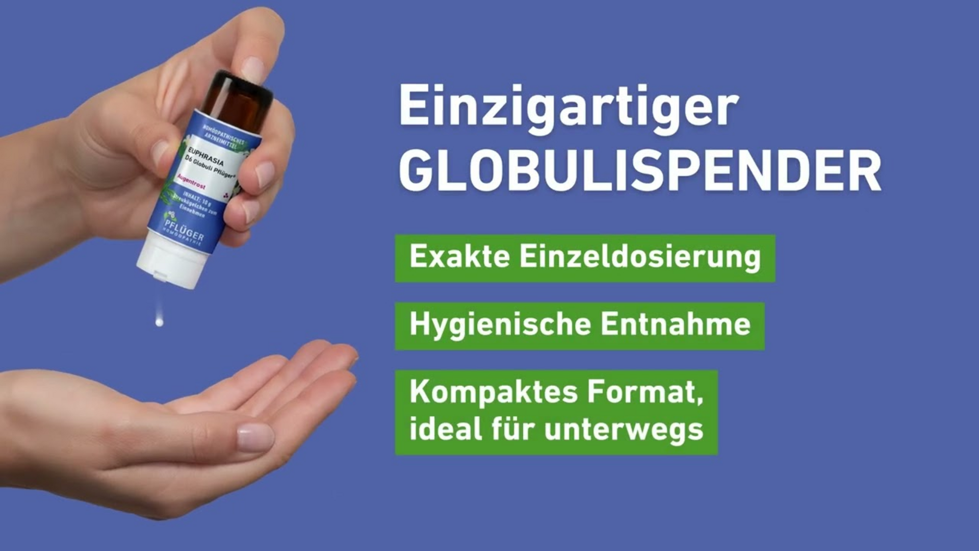 Nur von Pflüger gibt es Euphrasia im praktischen Globulispender. Dieser ermöglicht sowohl die hygienische Entnahme als auch eine exakte Dosierung. Unsere Verwender sind von der einfachen Anwendung begeistert und schätzen das kompakte Format auch für die Mitnahme unterwegs.