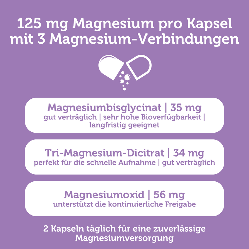 Die Kombination aus Magnesiumbisglycinat, Tri-Magnesium-Dicitrat und Magnesiumoxid gewährleistet eine optimale Aufnahme, hohe Verträglichkeit und eine nachhaltige Depotwirkung. Dadurch kann der Körper das Magnesium sowohl schnell nutzen als auch über längere Zeit speichern, was besonders für Menschen mit erhöhtem Bedarf oder empfindlichem Verdauungstrakt von Vorteil ist.