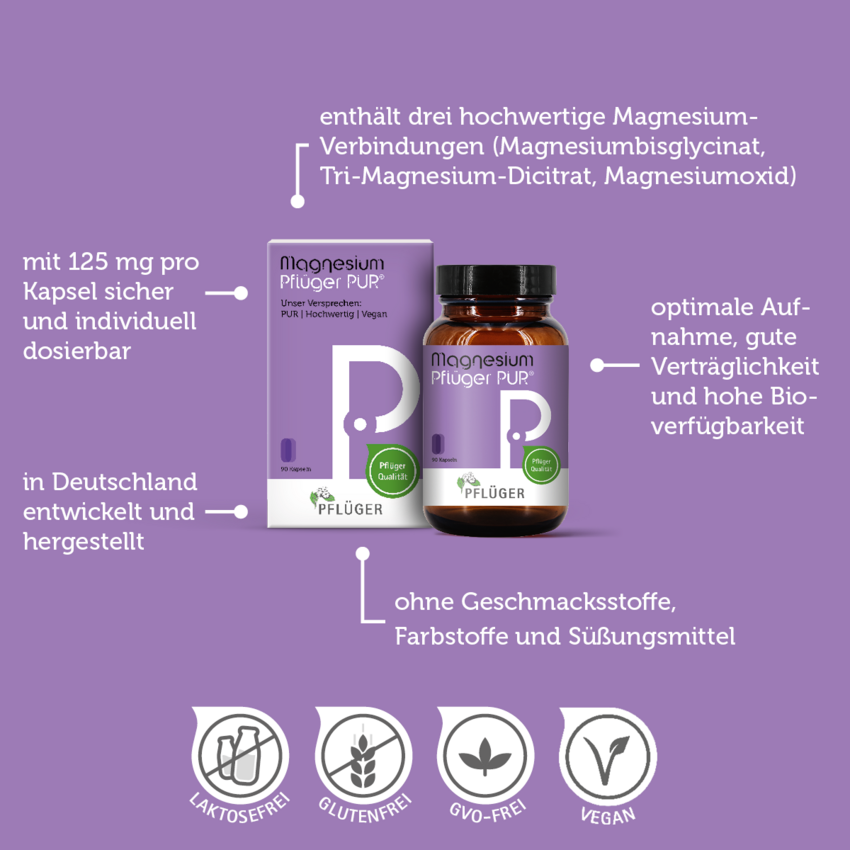 Magnesium Pflüger PUR® ist ein hochwertiges, veganes Nahrungsergänzungsmittel, das gezielt zur bedarfsgerechten Magnesiumversorgung entwickelt wurde.